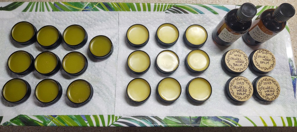 The first round of samples are ready. An herbal comfrey beeswax balm for skin care. A lovely 5 rose softener and repair cream in one small tin that has the scent of wild roses. Jewelweed spray and salve – an absolute must have in our house for the bug bites of summer and to lessen the crazy itching and skin disturbance that comes from contact with poison ivy and oak. Each of these natural herbal preparations are made from plants that I organically grow in my gardens and ethically gather from wild plants.