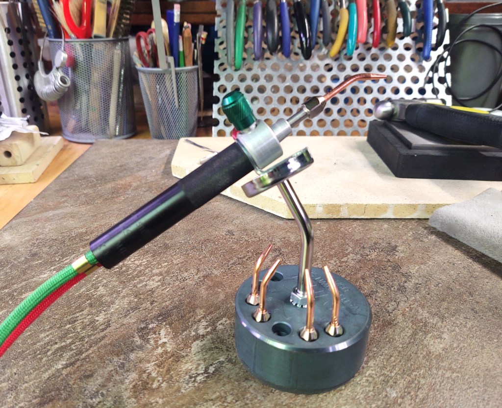 No more trying to use a heavy, unwieldy torch head or worrying about the dangerous oxygen tank sitting under my work bench. A ‘small’ propane cylinder now provides the flambe’ soldering juice and contributes to a safer working space. Thank you Rio – I breath a bit easier with this set-up.