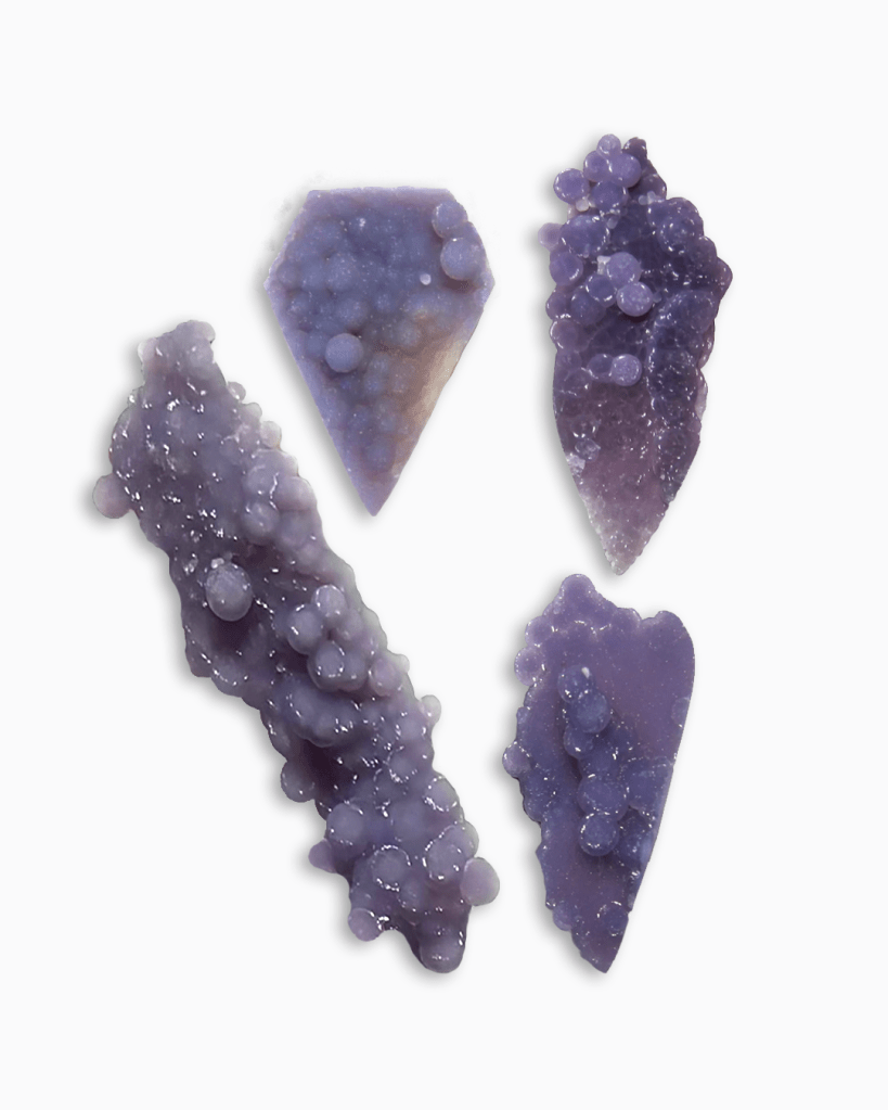 Spheroidal Amethystine – isn’t this a mouthful? AKA Grape Agate is a botryoidal form of chalcedony in the quartz rock family. Grape agate is a newcomer to the “interesting gemstone” scene, having been brought to the market in 2015. It’s found primarily in Indonesia, with some discoveries in the Green River area of Utah showing reddish-orange hues. Personally, I don’t find the Utah grape agate to be as visually exciting as the Indonesian stones. The Utah variety is, however, a unique stone for collectors.