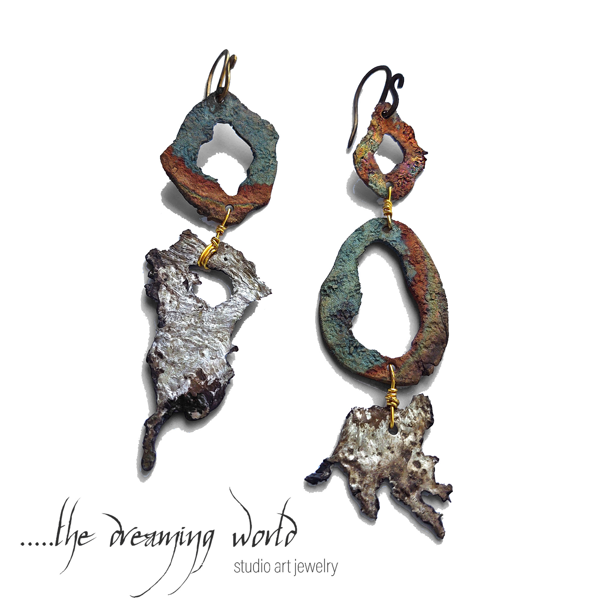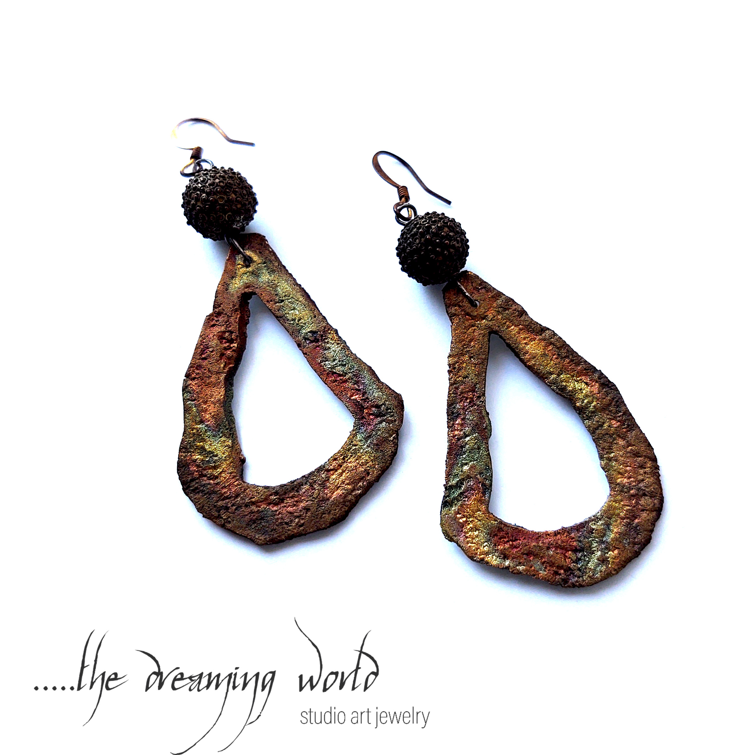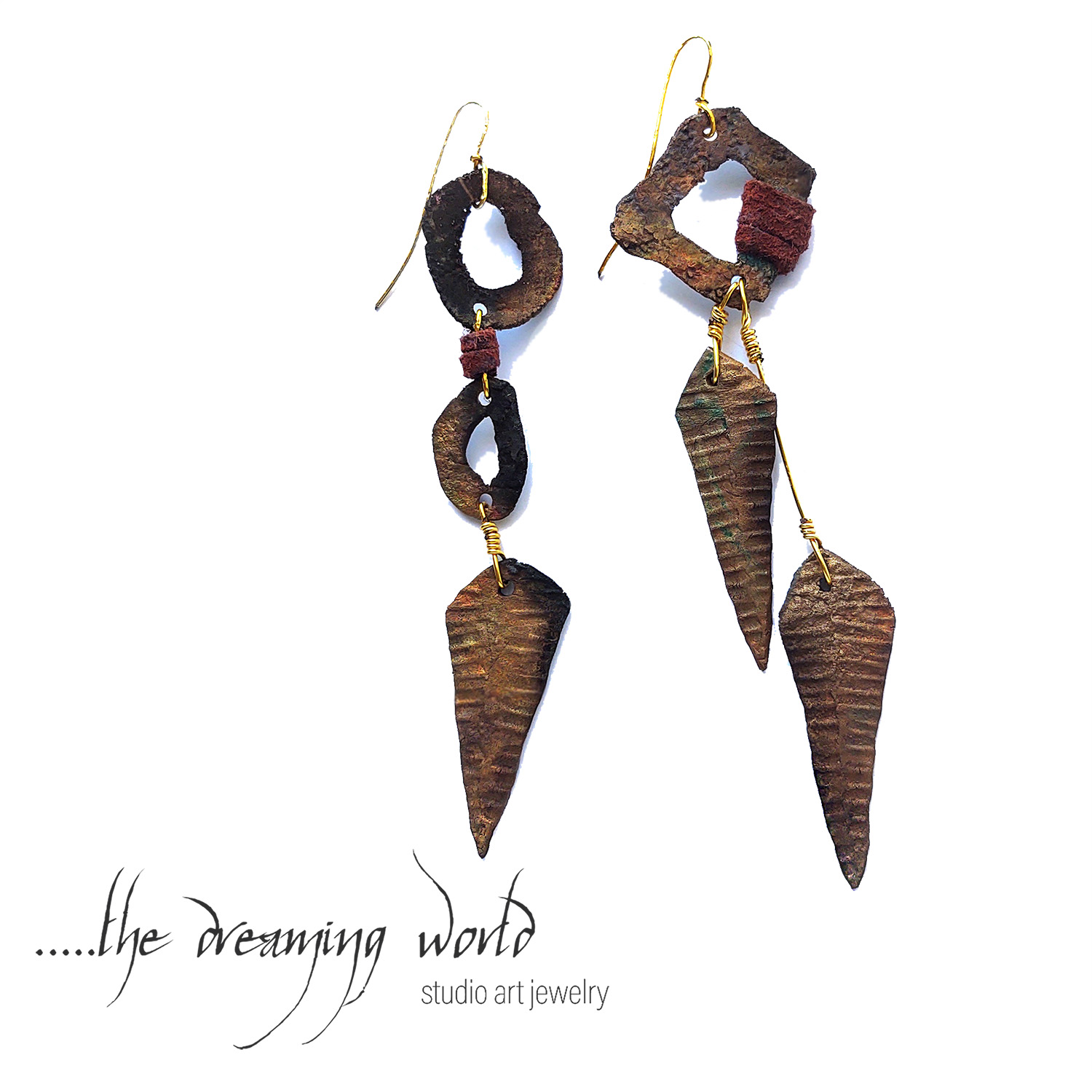 Earthy, organic style in aged metal, patina oxide colors. These one of a kind earrings are stunning. Tribal goddess, boho fashionista, playa babe- these are the perfect earrings. 6″ length Free shipping!